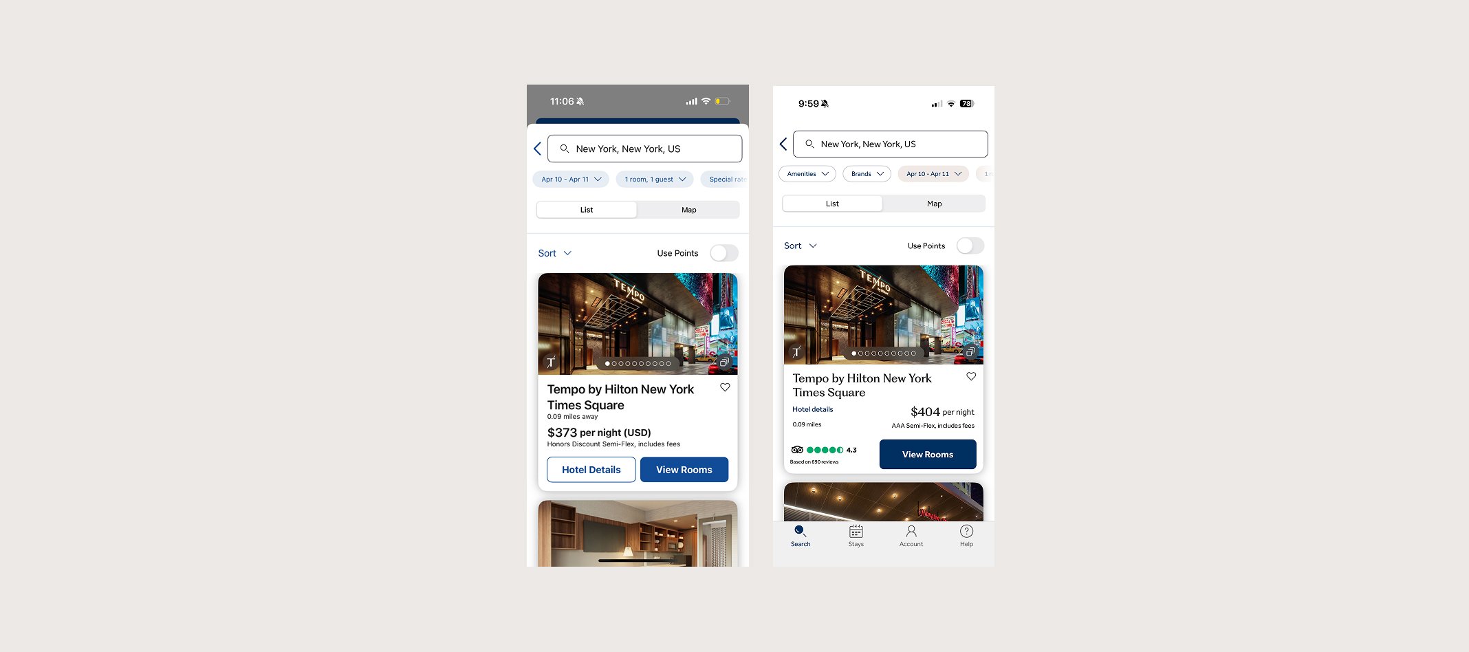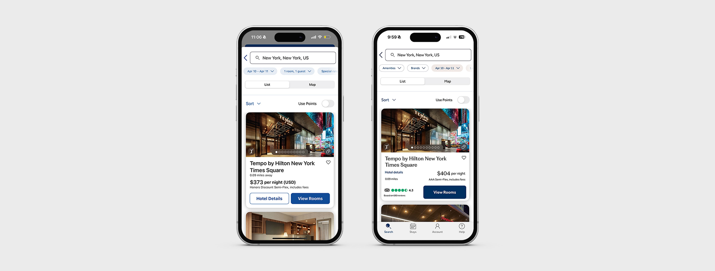 I led UX design enhancements for Hilton’s mobile app Shopping and Booking experience—redesigning search results cards, optimizing Add-Ons customization, and delivering high-performing reassurance messaging that drove the highest single-test revenue lift to date, $48M app. Partnering closely with the Digital Experimentation team, I used A/B testing to guide design decisions and delivered substantial business impact: in 2024, 72 experiments drove $134.4M in revenue across Shopping and Booking.